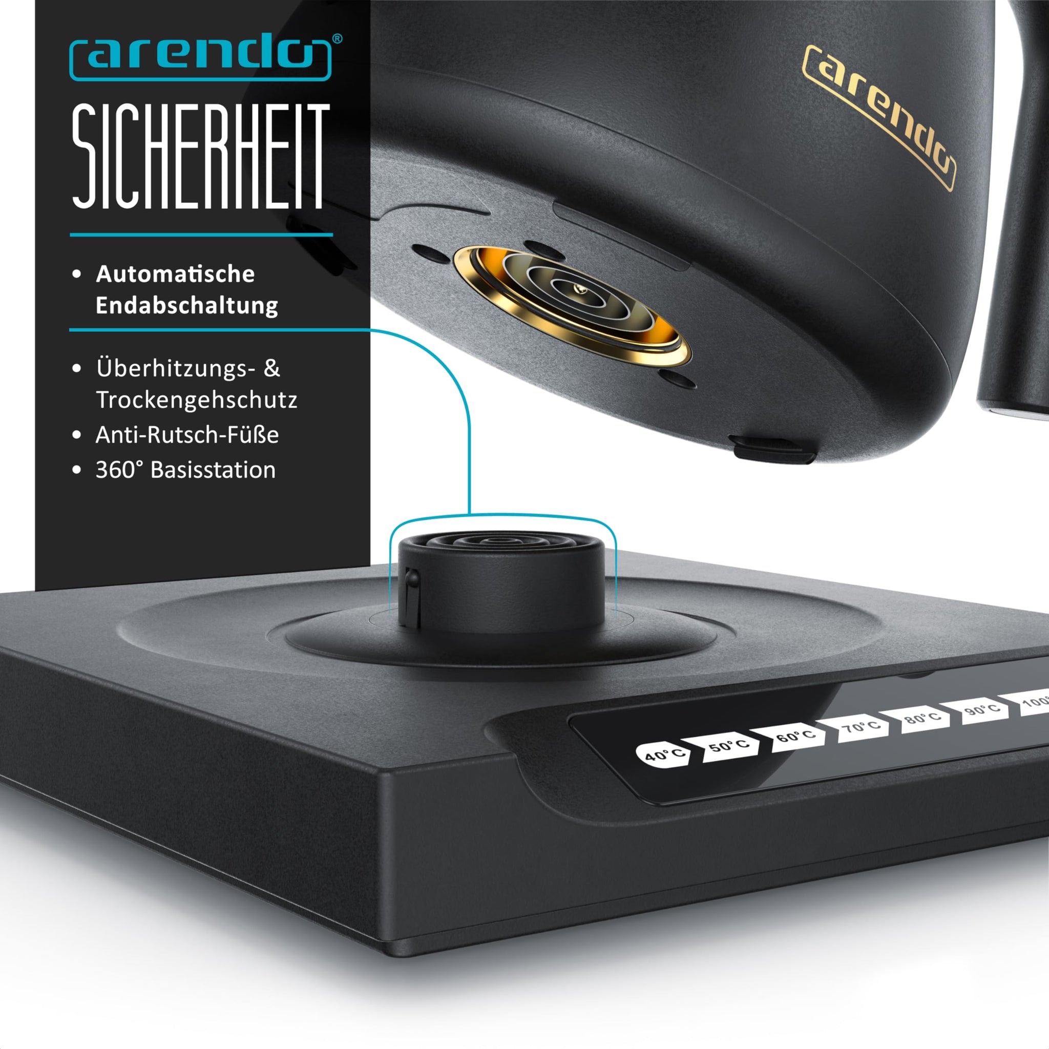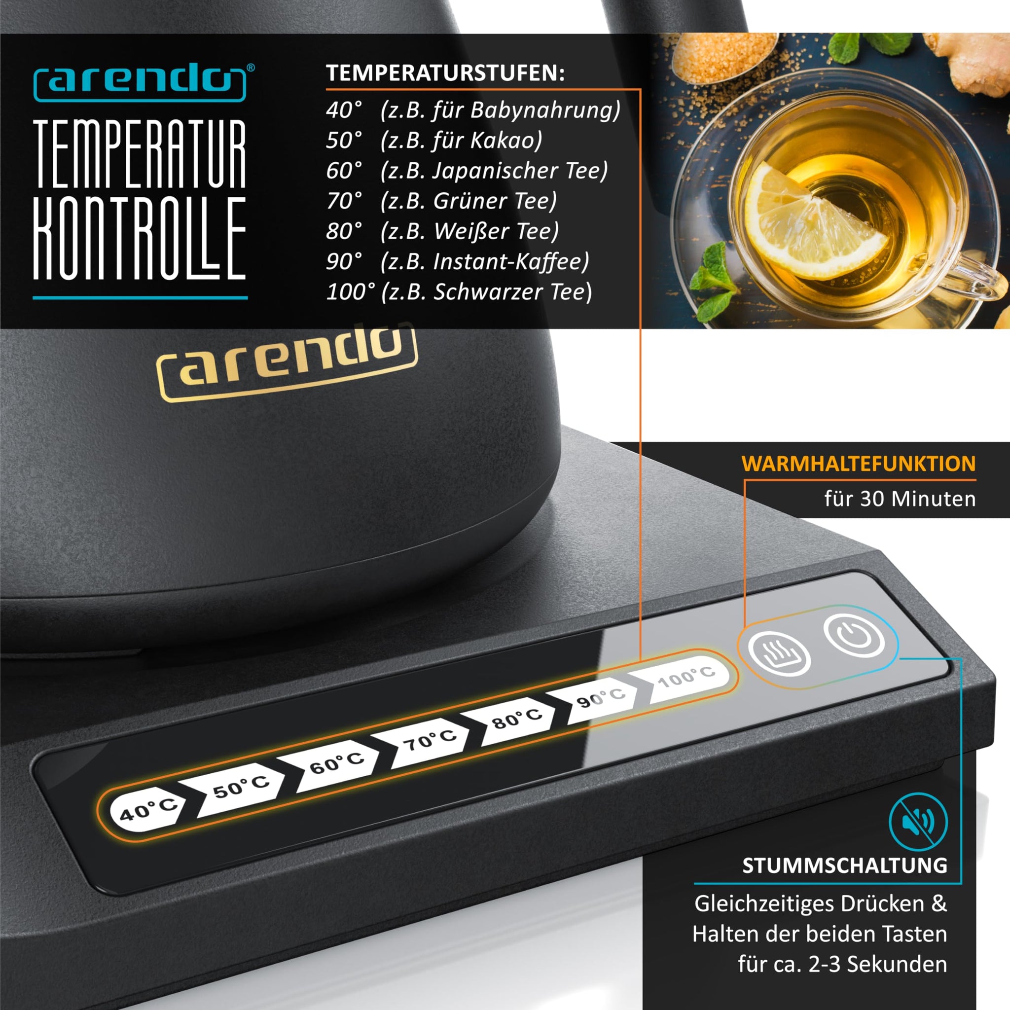 - 360° BASISSTATION MIT SENSORTASTEN. Ausgestattet mit modernem STRIX-Controller für einfache Handhabung. An den Sensortasten (Touch) wählen Sie die Zieltemperatur aus: frei wählbare Temperaturstufen von 40° bis zu 100°C. So können Sie die Temperatur z.B. perfekt auf Ihre Teesorte abstimmen. Mit 30 minütiger Warmhaltefunktion.