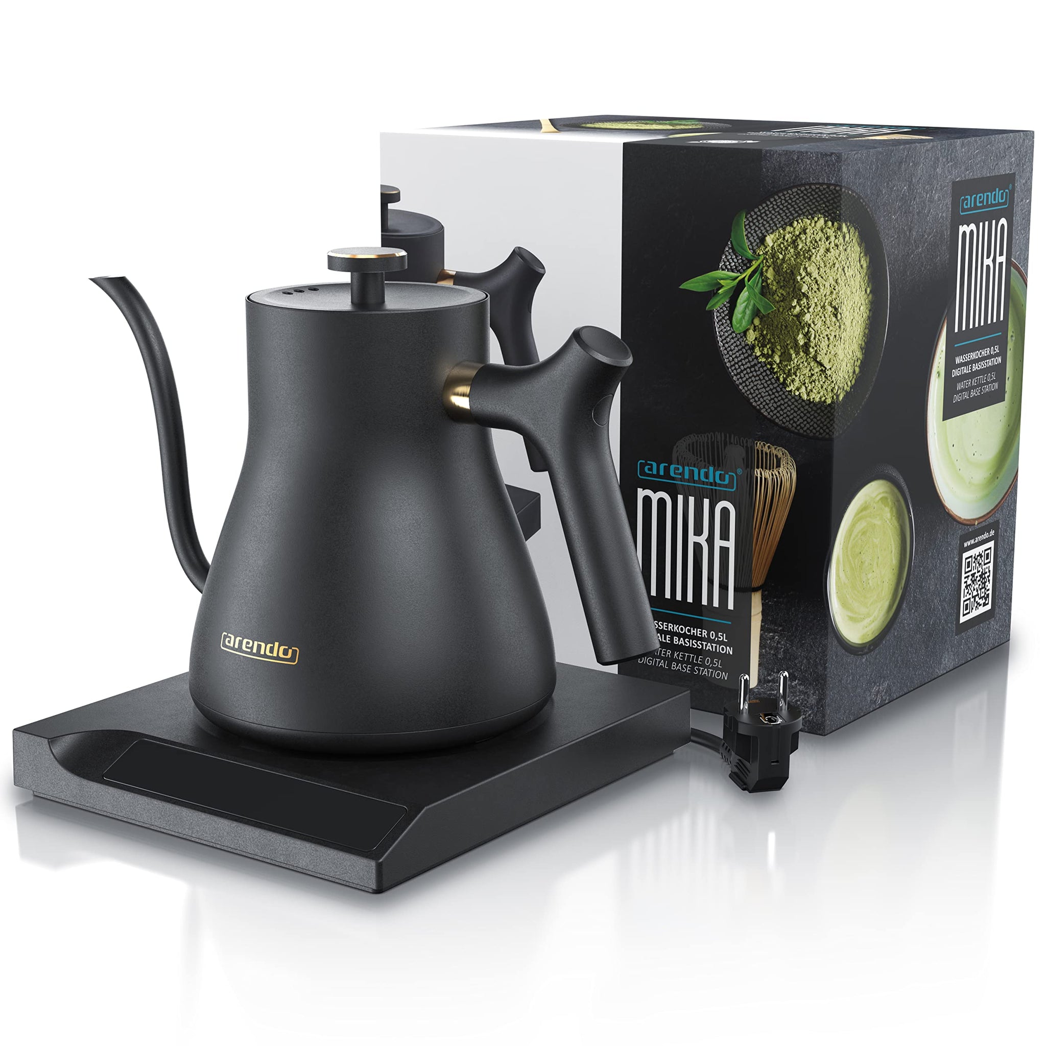 - AUSSTATTUNG: Wasserkocher MIKA, Fassungsvermögen: 0,5 Liter | wählbare Temperaturen: 40°, 50°, 60°, 70°, 80°, 90°, 100°C | Warmhaltefunktion 30 Minuten | 360° Basisstation mit 2 Sensortasten und Sensorleiste: Temperatur wählen// Warmhalten // Kochen // EIN/AUS | Temperaturfühler mit Zwischenmessungen | LED-Anzeige | Signalton (abschaltbar) | Verdecktes Edelstahl Heizelement | Automatische Abschaltung | Trockengeh- und Überhitzungsschutz