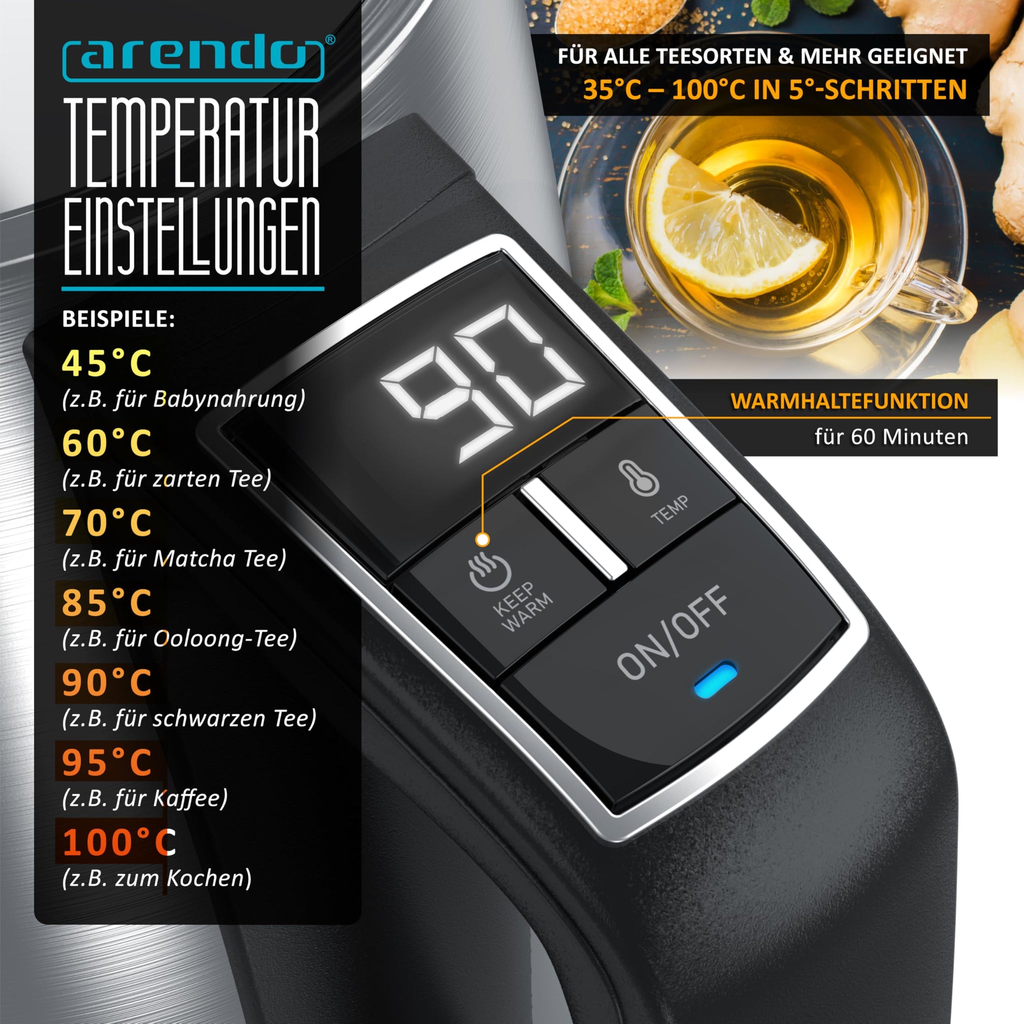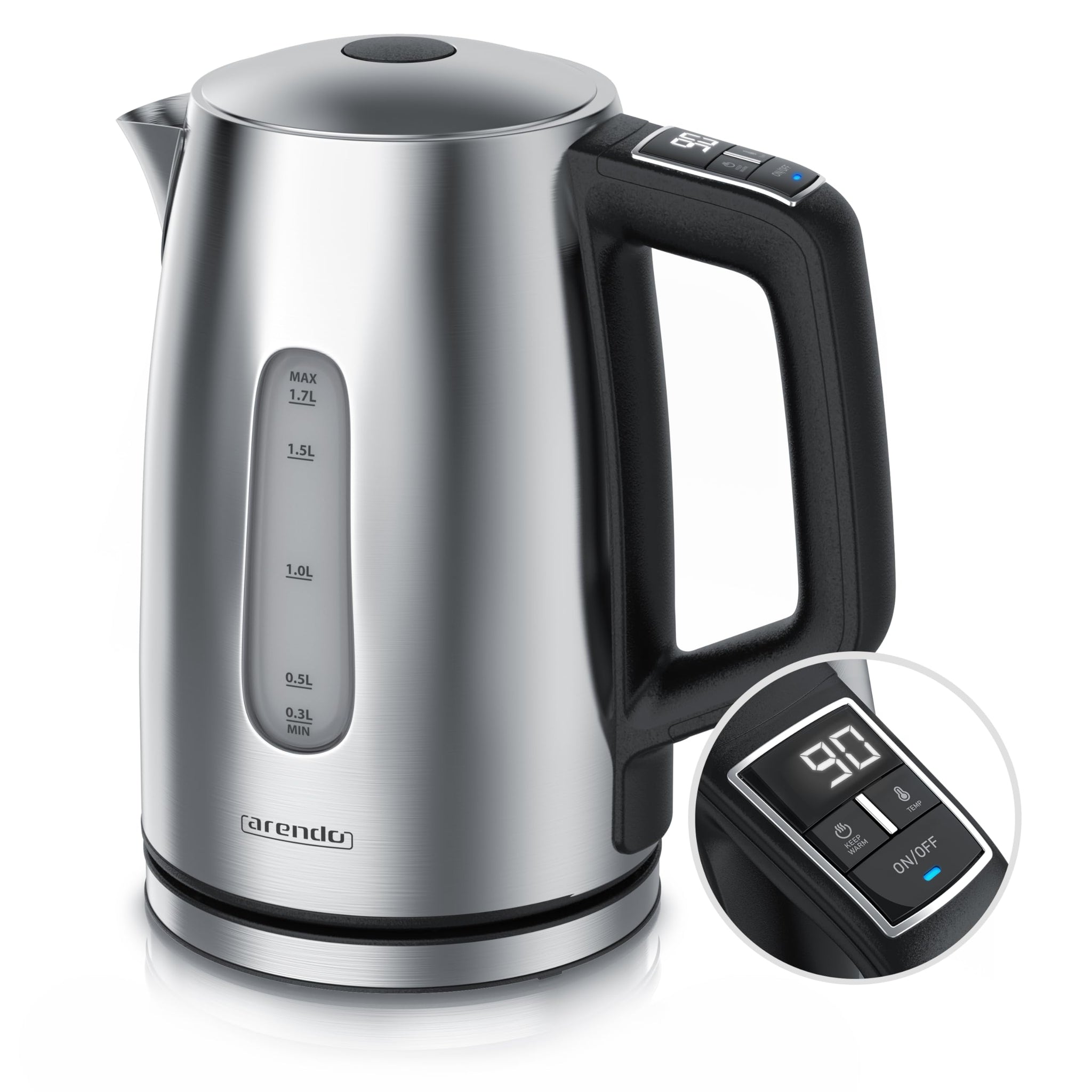 Arendo - Wasserkocher mit Temperatureinstellung - Edelstahl - Temperaturauswahl 35°C bis 100°C – LED Display – Warmhaltefunktion – One-Touch Deckelöffnung – Sichtfenster für Wasserskala